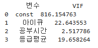 결과해석: 아이큐와 등급 평균의 vif(팽창계수) 가 10보다 큽니다. 아이큐가 시험점수에 영향이 있다 라는 가설검정을 하고 싶다면 등급평균을 빼고 다중회귀 분석을 해야합니다.