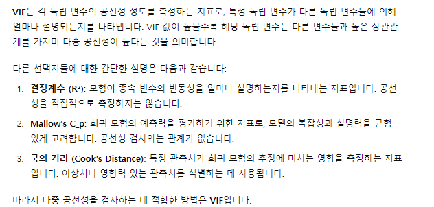 [빅분기 필기 관련 시험문제] 기출문제 6회 시험. 수제비 5-57. 42번문제 문제. 다중 회귀모형 다중 공선성을 검사하는 방법으로 가장 알맞은 것은 ?
