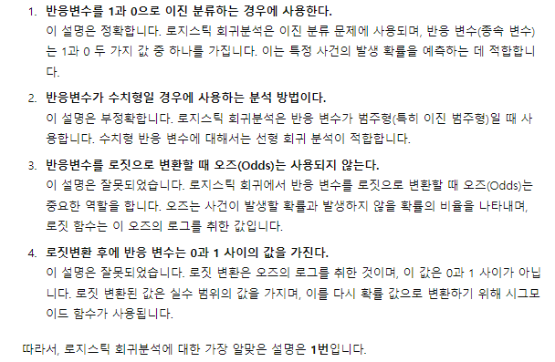 기출문제2. 수제비 5-46, 51번. 다음중 로지스틱 회귀분석에 대한 설명으로 가장 알맞은 것은 ? 1. 반응변수를 1과 0으로 이진 분류하는 경우에 사용한다. 2. 반응변수가 수치형일 경우에 사용하는 분석 방법이다. 3. 반응변수를 로짓으로 변환할 때 오즈(Odds) 는 사용되지 않는다. 4. 로짓변환 후에 반응 변수는 0과 1 사이의 값을 가진다