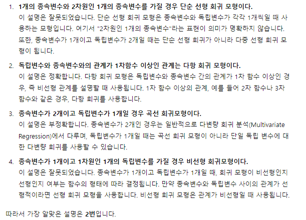 기출문제1. 수제비 5-47. 60번. 다음중 회귀분석에 대한 설명으로 가장 알맞은 것은? 1. 1개의 종속변수와 2차원인 1개의 종속변수를 가질 경우 단순 선형 회귀 모형이다. 2. 독립변수와 종속변수와의 관계가 1차함수 이상인 관계는 다항 회귀 모형이다. 3. 종속변수가 2개이고 독립변수가 1개일 경우 곡선 회귀모형이다. 4. 종속변수가 1개이고 1차원인 1개의 독립변수를 가질경우 비선형 회귀모형이다.