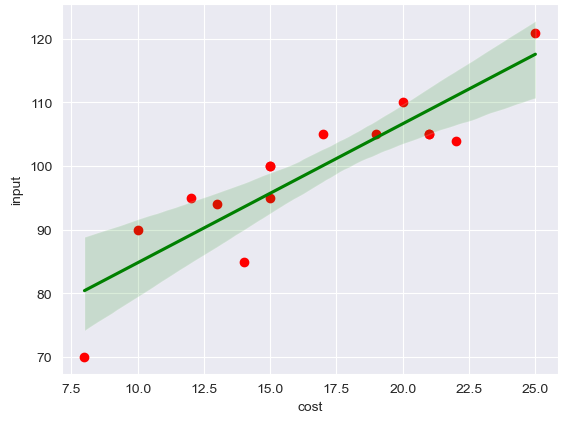 sns.regplot(x='cost', y='input', data=reg,scatter=False, fit_reg = True, color='green')