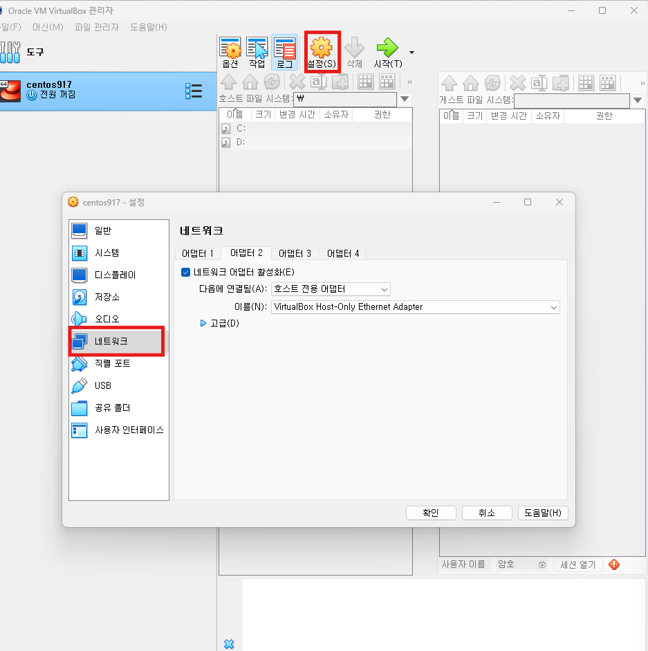 2. 오라클 vm 박스에서 가상환경 centos의 설정을 누르고 네트워크를 설정함